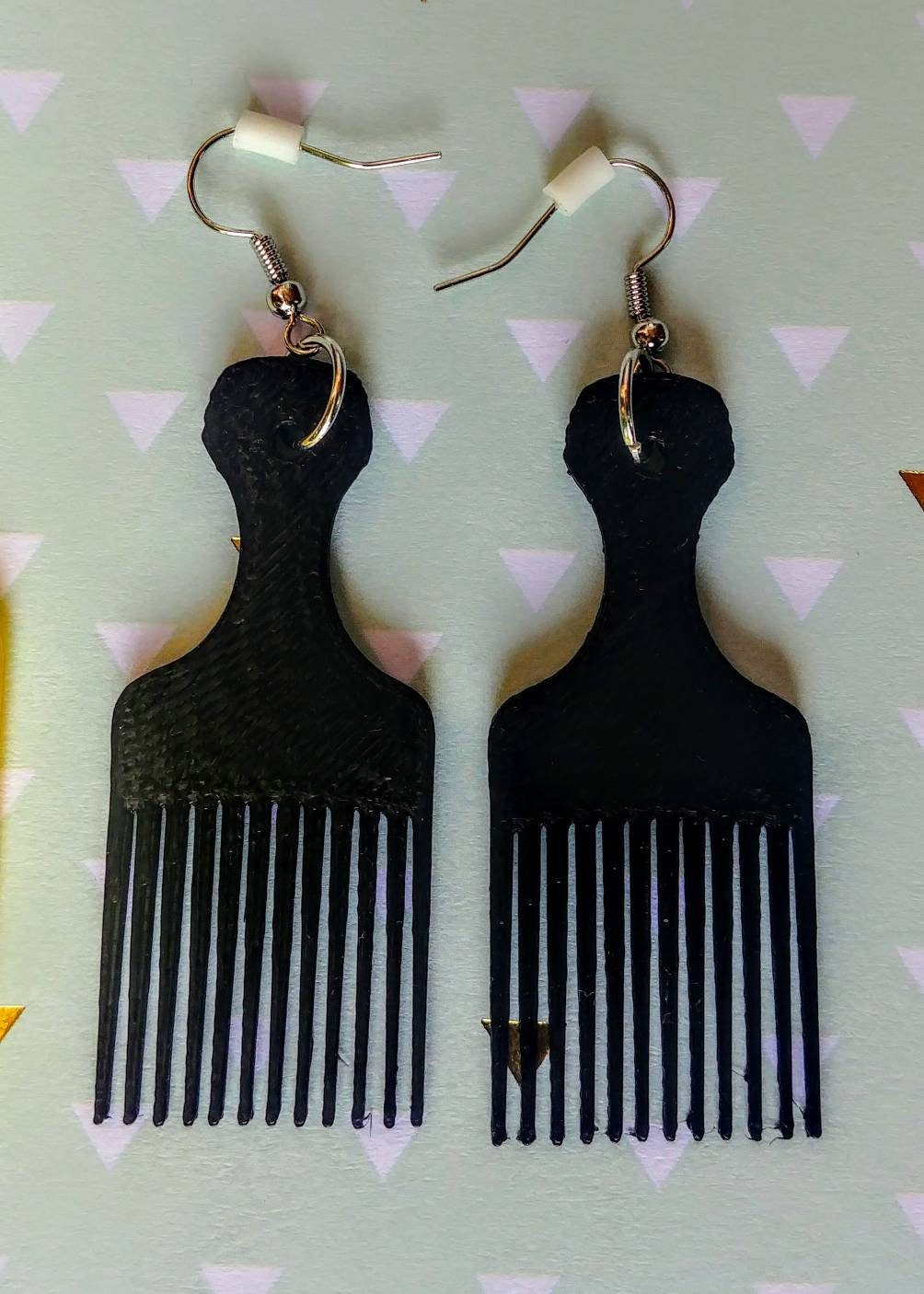 These fun 3D printed earrings really make a statement. These Afro pick earrings are unique and will certainly attract compliments. These earrings are 3D printed using layers of PLA filament. They are sturdy, yet lightweight.
