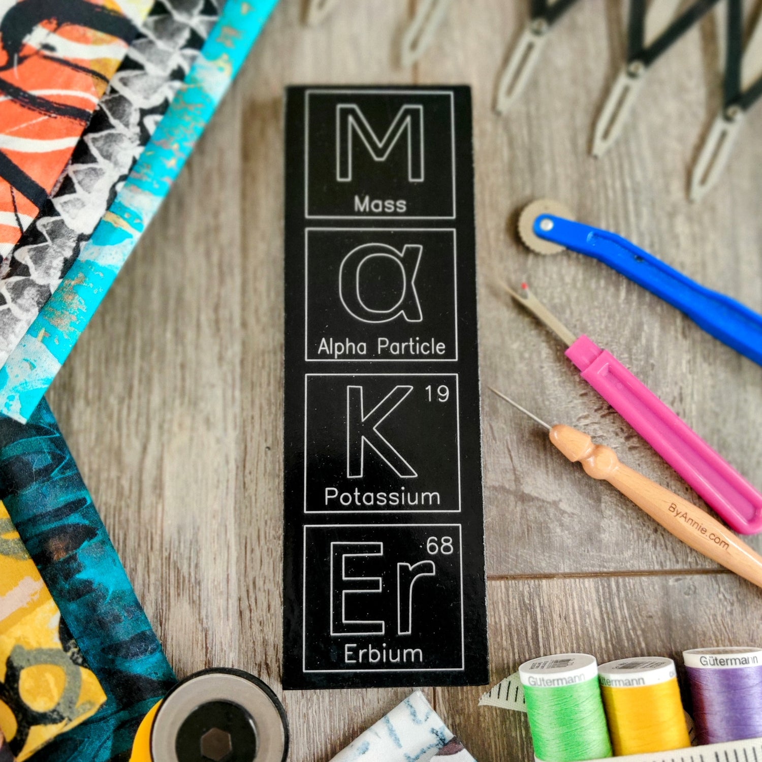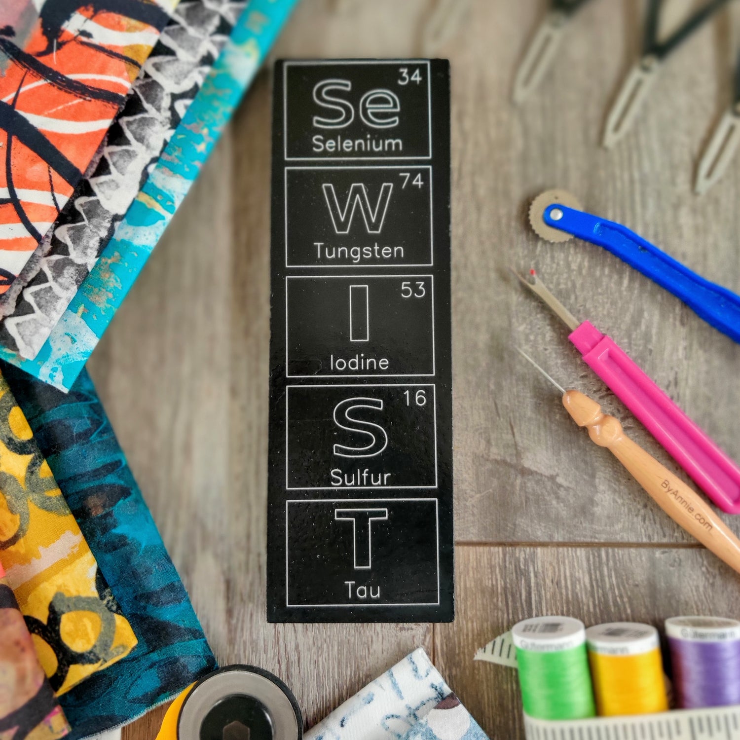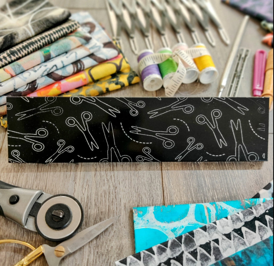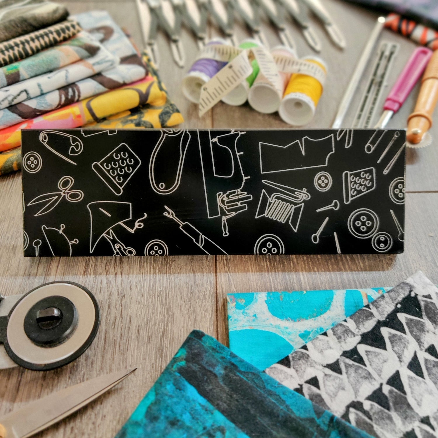 This 9in. x 3in. 1lb .12oz. rectangle pattern weight with bold images. Each weight is backed with adhesive felt to protect your pattern and fabric while cutting.