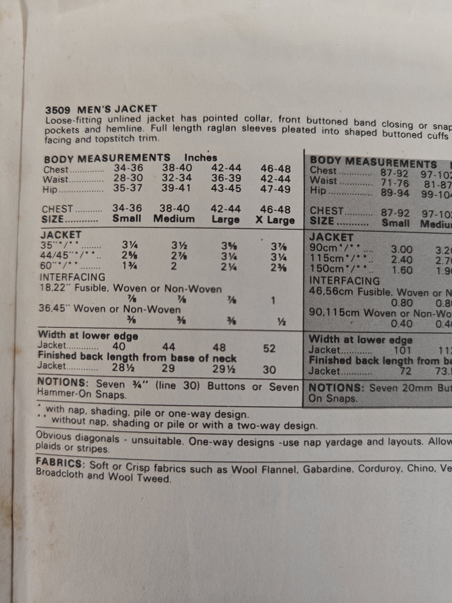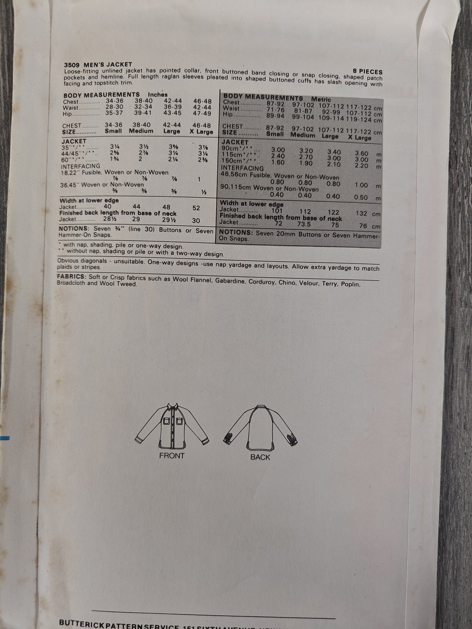 Butterick 3509 Men's Unlined Jacket. Size 34. Small.