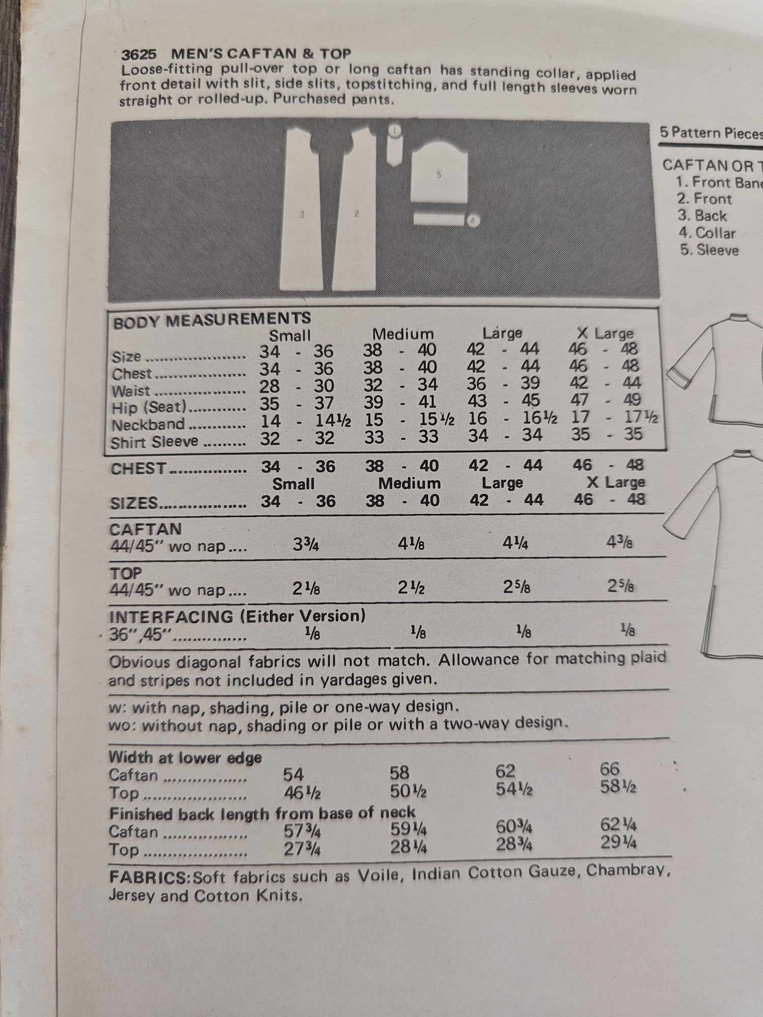 Butterick 3625 men's Caftan and top. Size 34. Small.