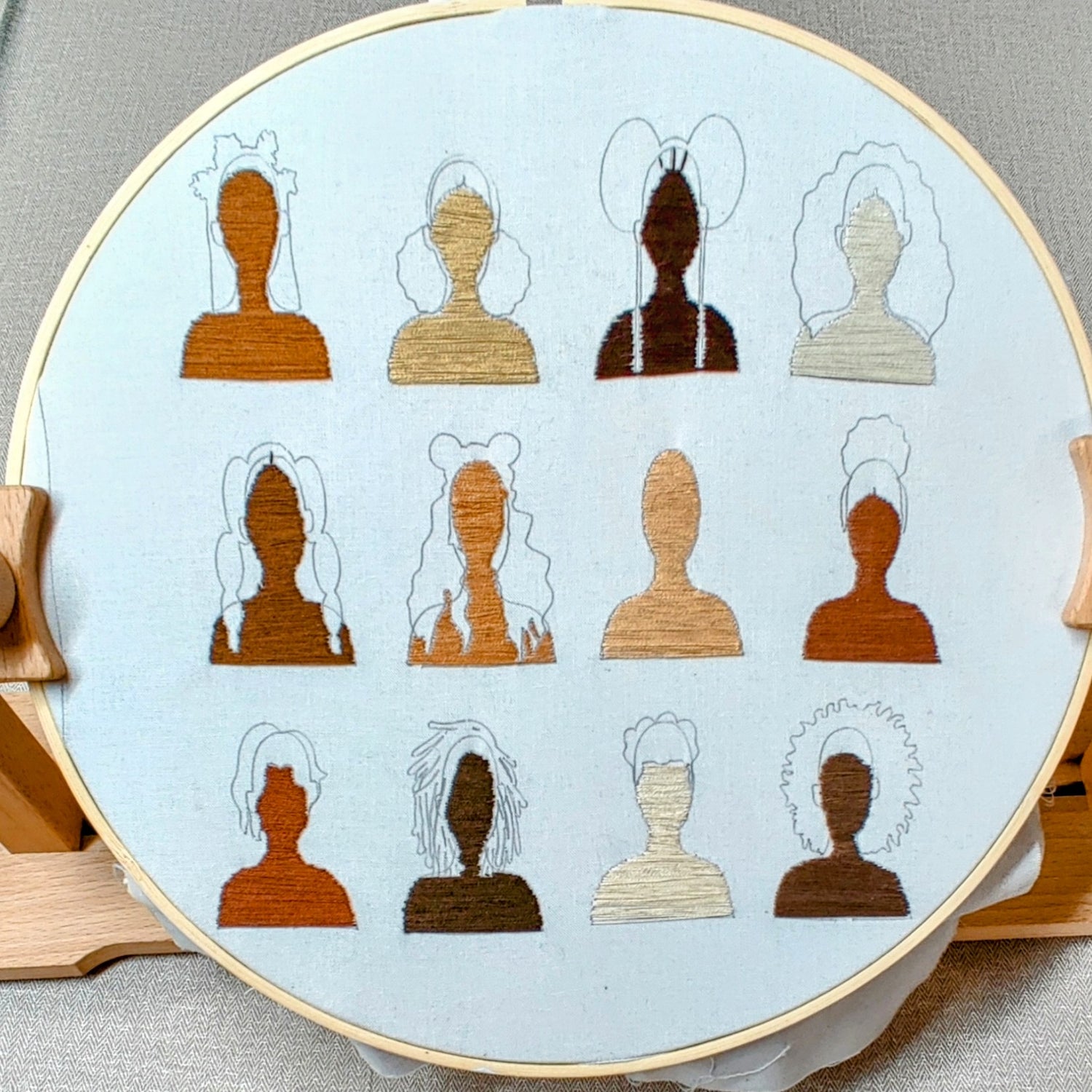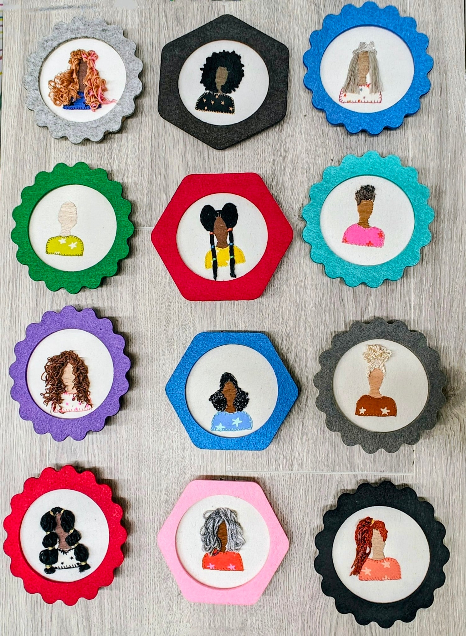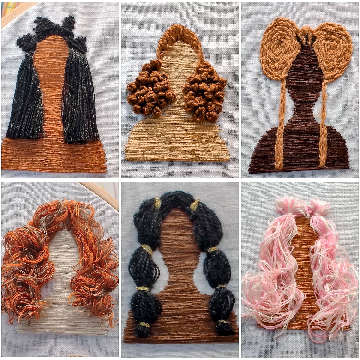 Use the 12 figures to play with texture as you stitch: Braids, Bubble Ponytails, an Afro, Loose curls, a High ponytail, Low Afro puffs, Dreadlocks and Buns.