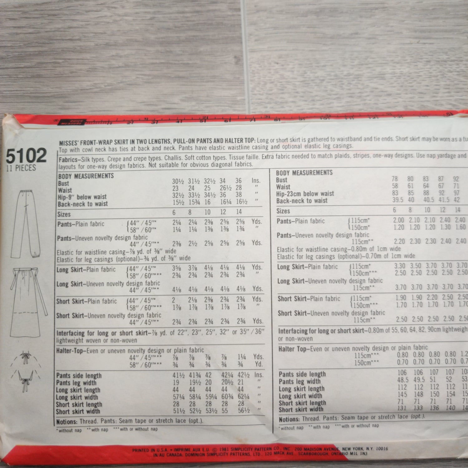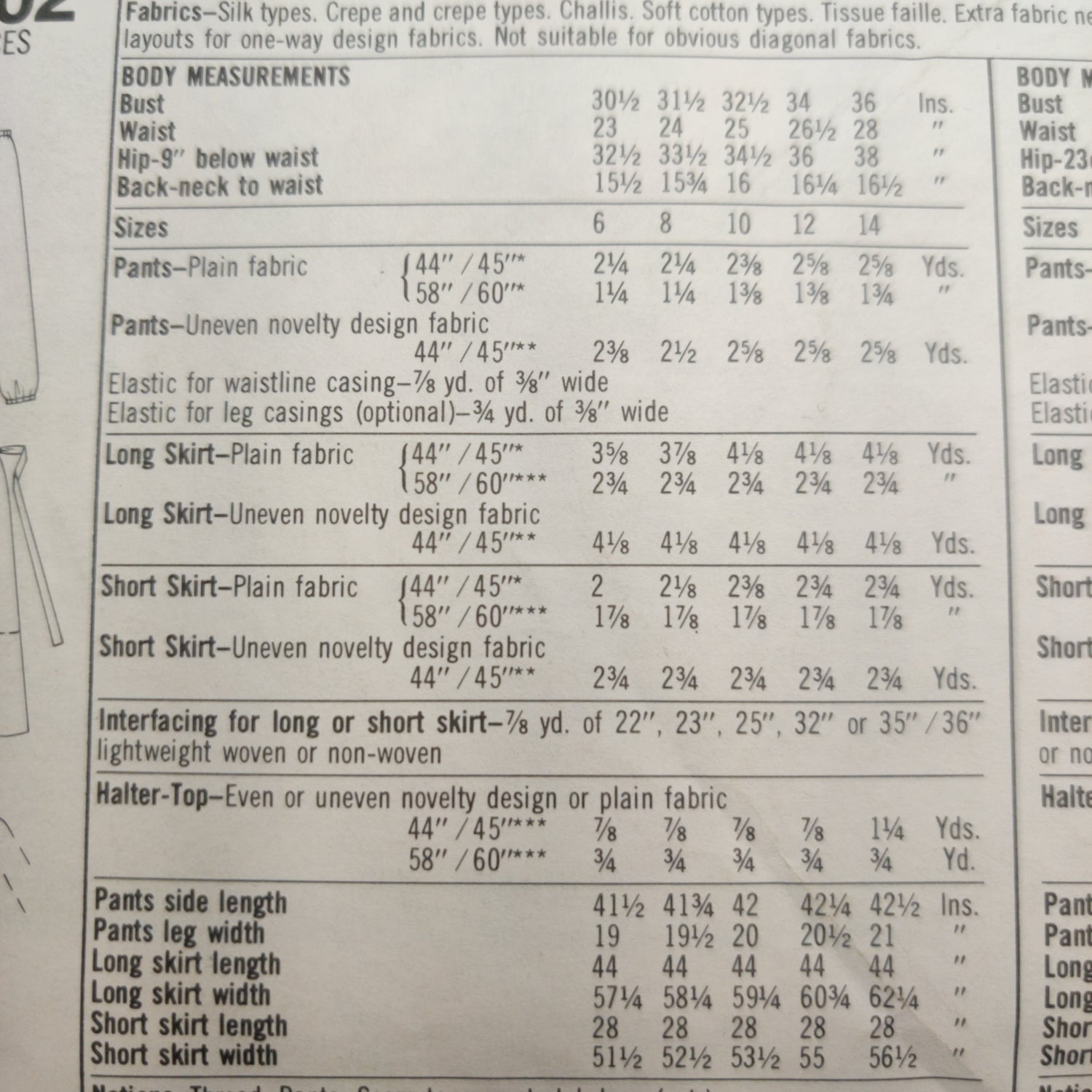 Misses front wrap skirt into lengths, pull-on pants and halter top.