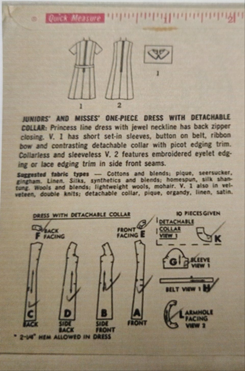Misses and Junior's one-piece dress with detachable collar. Size 12 Bust 32.