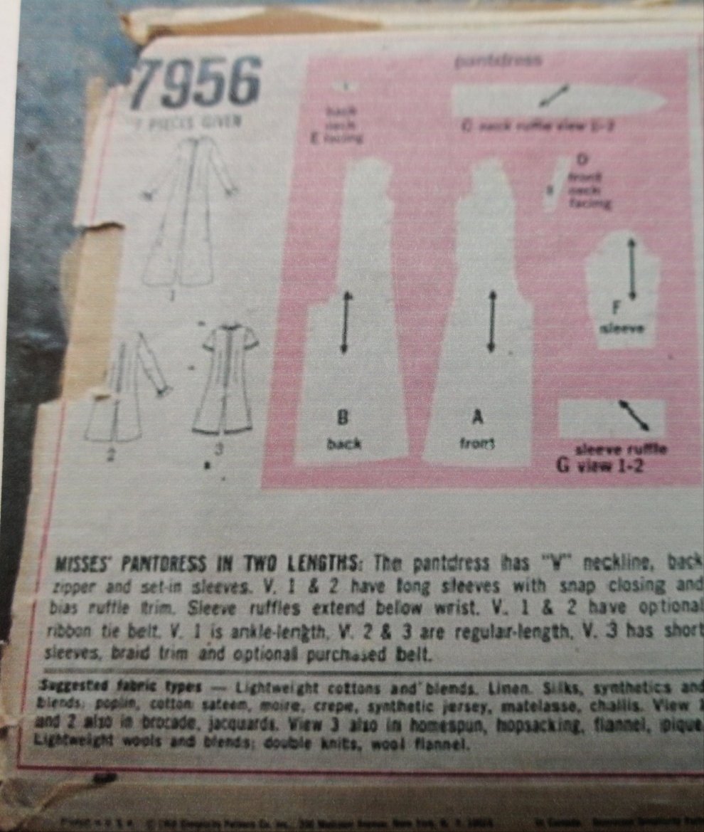 Misses pantdress in two lengths the pantdress has v-neckline, back zipper, and set-in sleeves. Size 12 Bust 34.