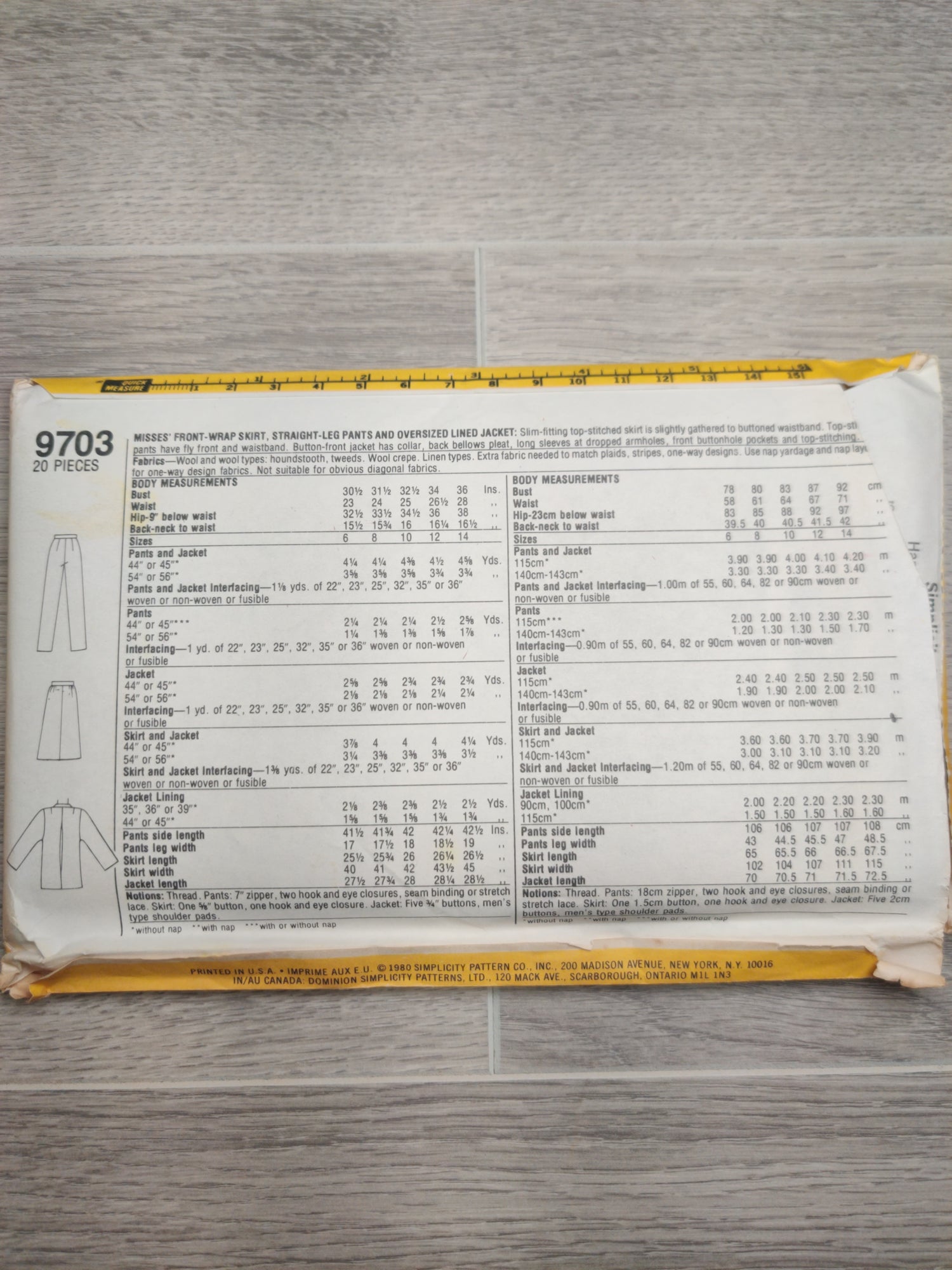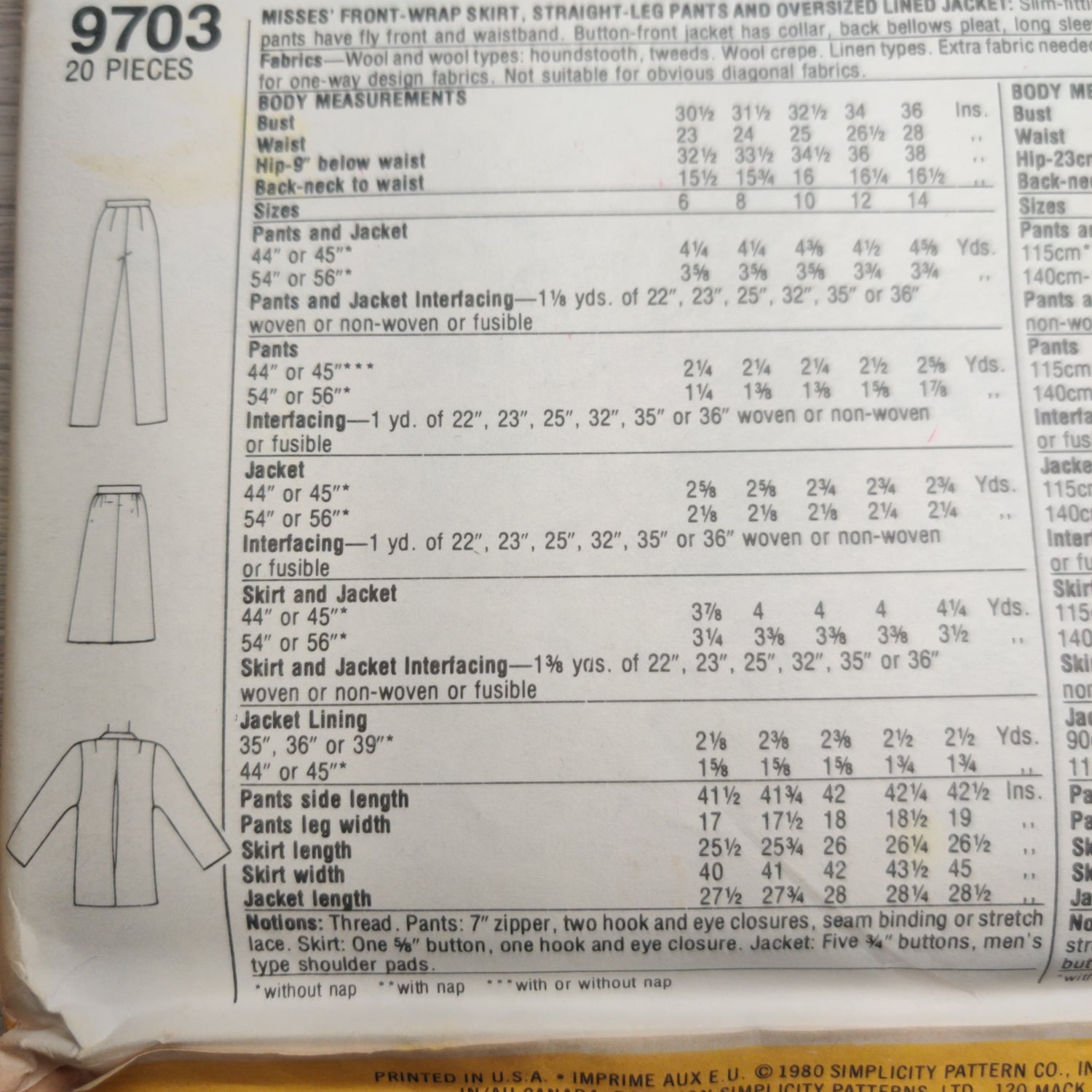 Misses front wrap skirt, straight-leg pants and oversized lined jacket. Richard Assatly
