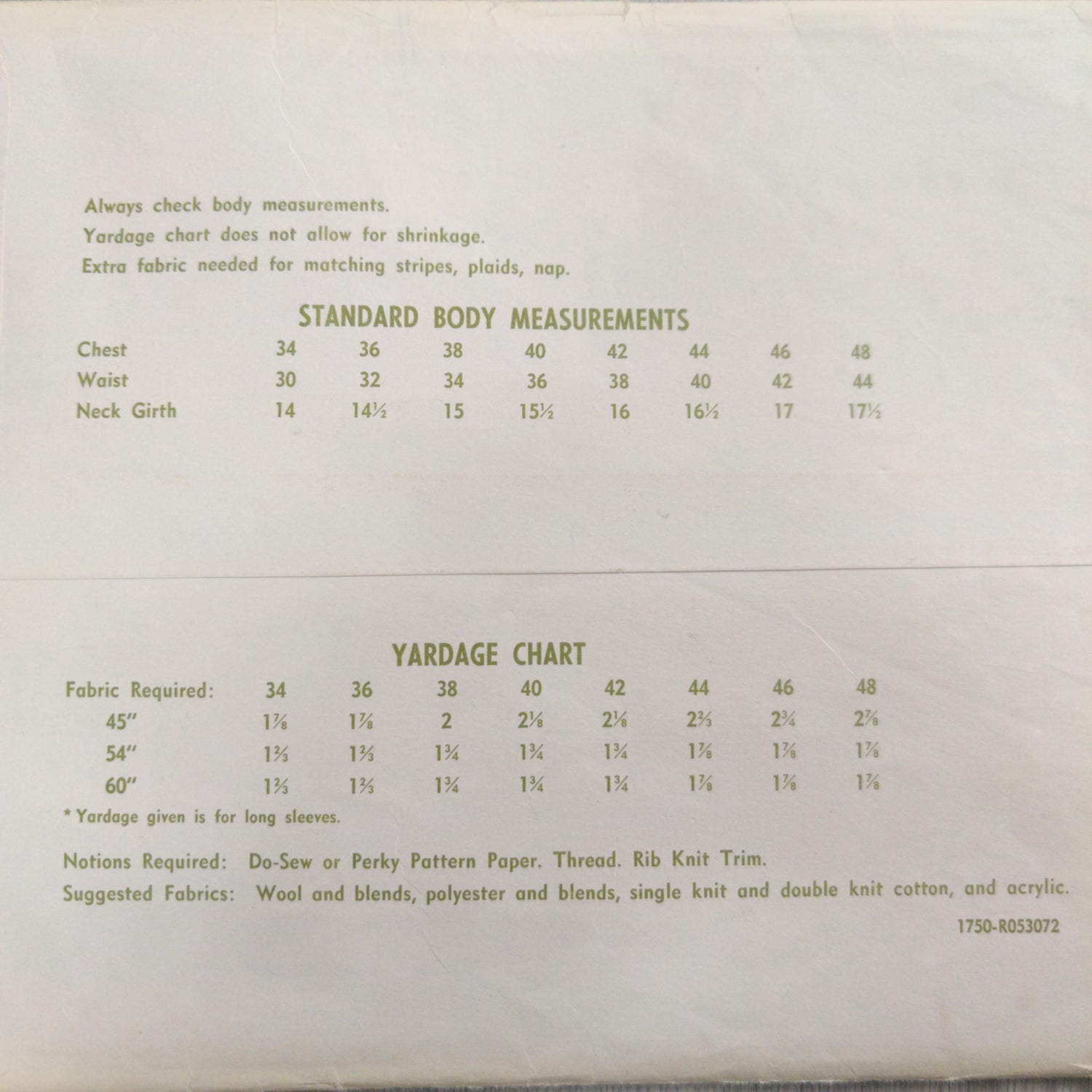 Men's set in sleeve t-shirt tab front included. This pattern designed exclusively for knit fabrics. Sizes 34-48