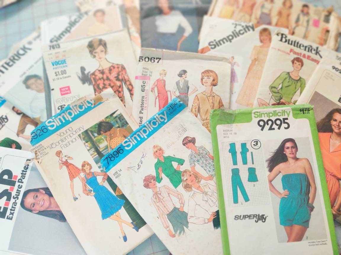 This listing is for mystery sewing pattern bundles from assorted decades (1960-early 2000's). The bundles are sold in groups of 10 unless noted in parentheses () next to the size. The condition of the patterns runs the gamut from uncut factory-folded to cut and well used. Cut patterns will be checked for completeness. Note: if a pattern is cut, but is missing small, easy to draft or common pieces like facings, a tie belt, sleeve or pocket, it may be included. The bundles are randomly assigned. If you have a particular garment in mind, leave a note on your order form and I will try to honor it.