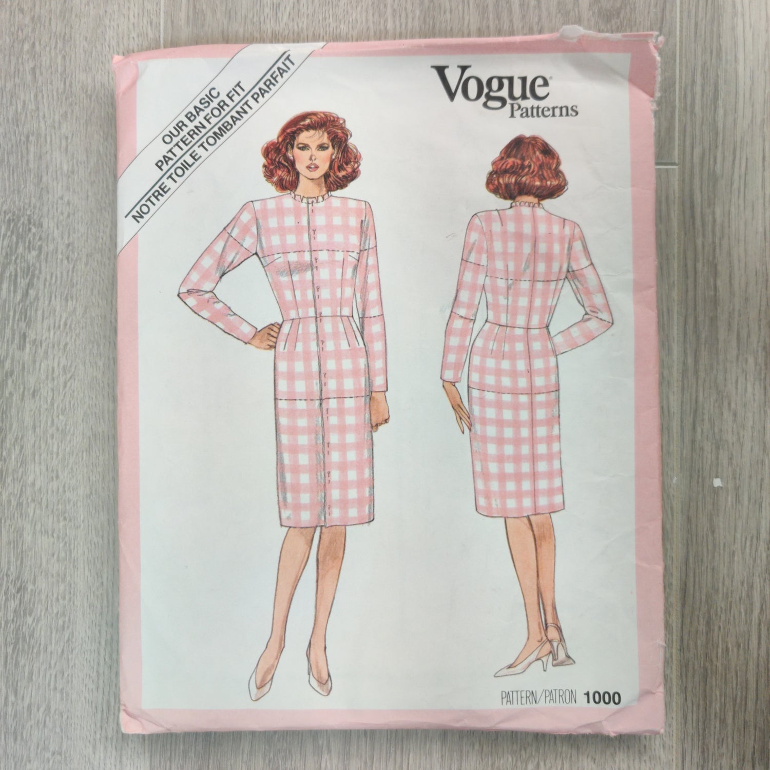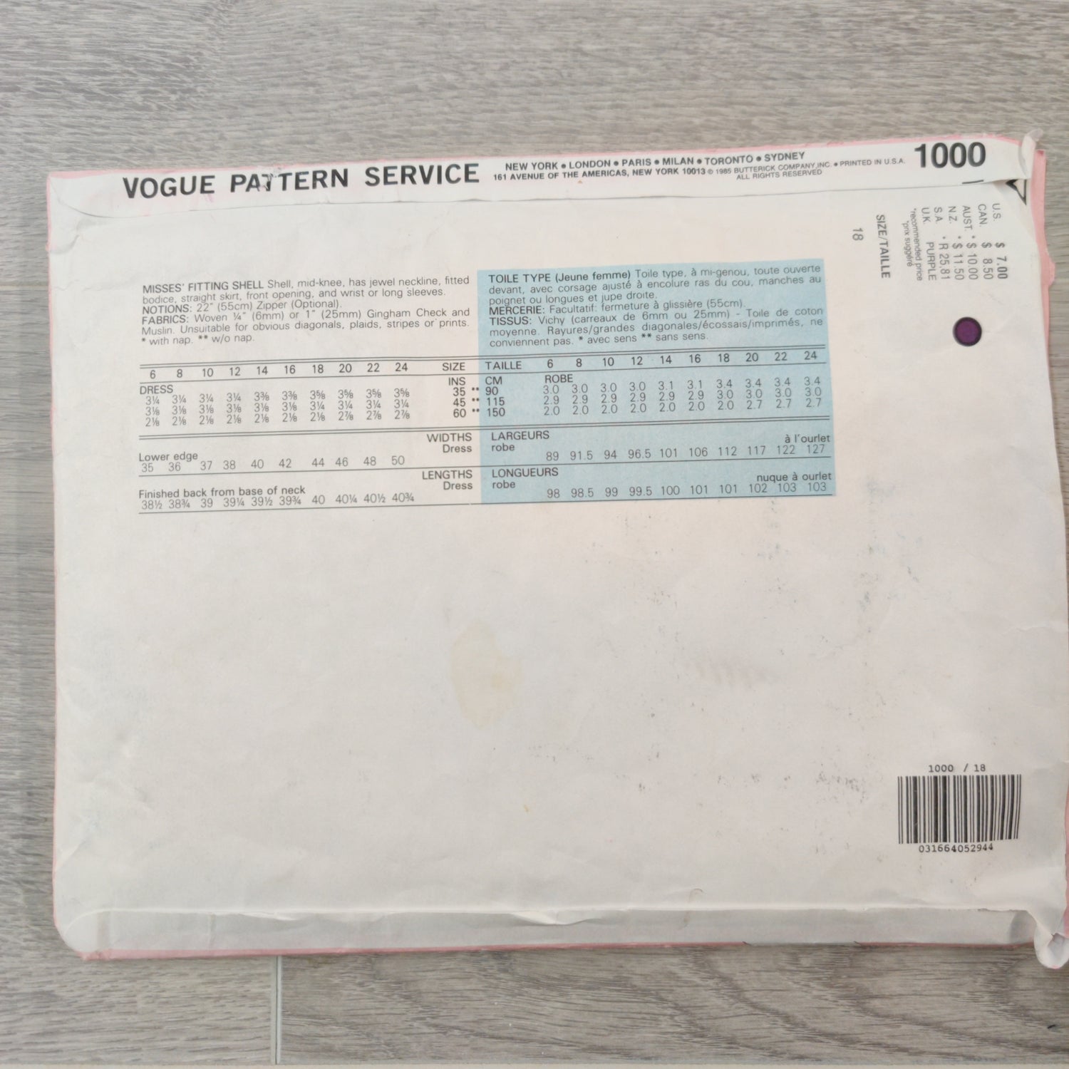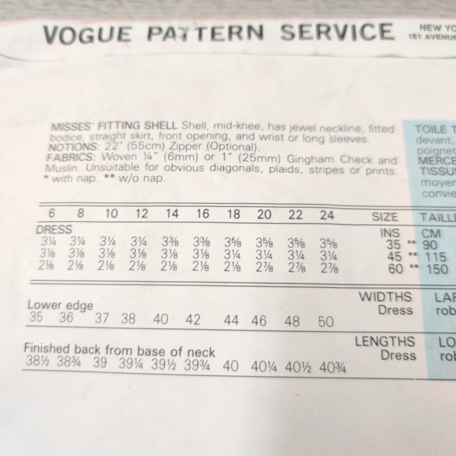 Misses fitting shell pattern. Shell, mid-knee, has jewel neckline, fitted bodice, straight skirt, front opening, and wrist or long sleeves. Sloper pattern