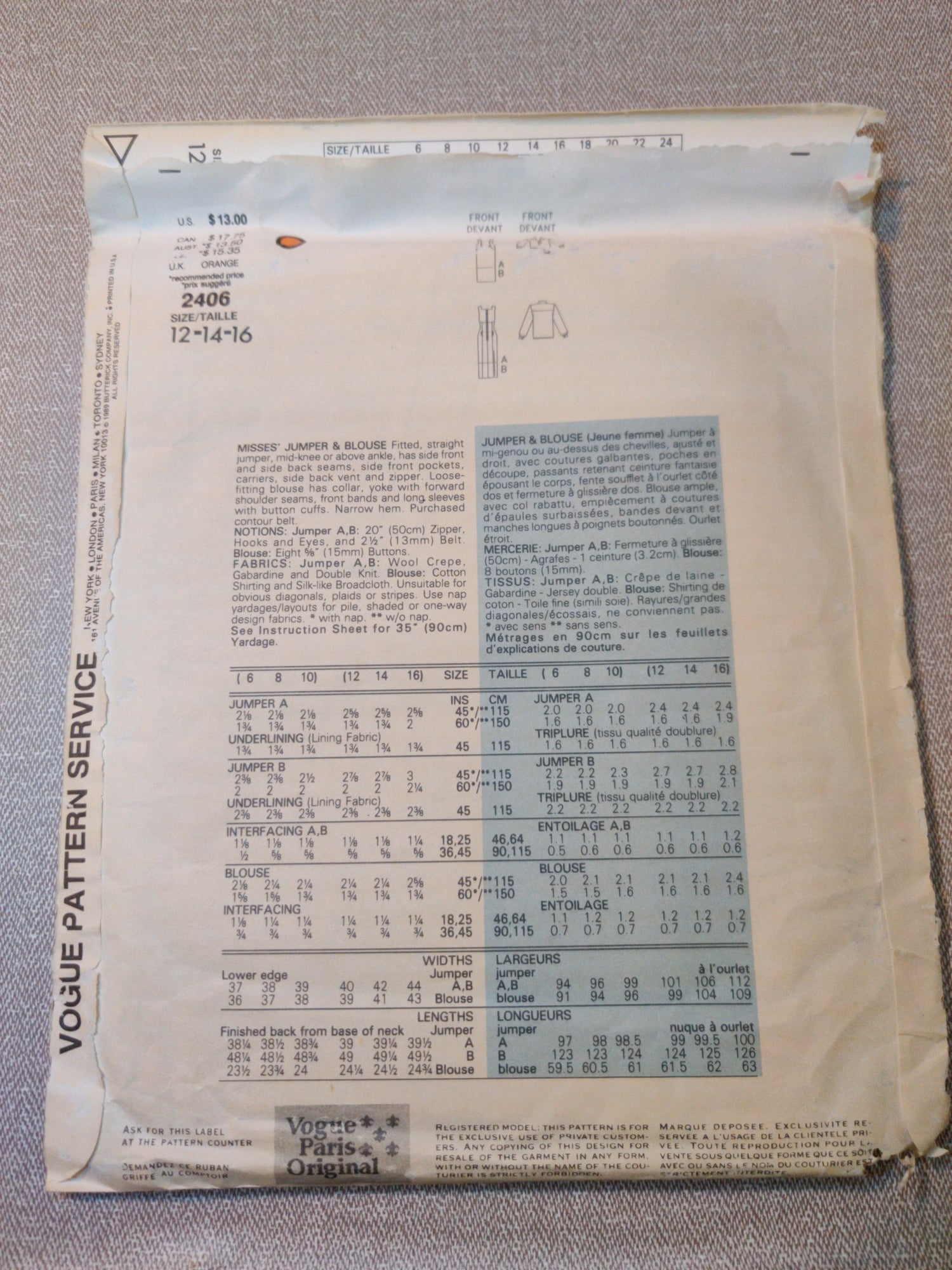 Vogue 2406 Karl Lagerfeld Size 12-14-16